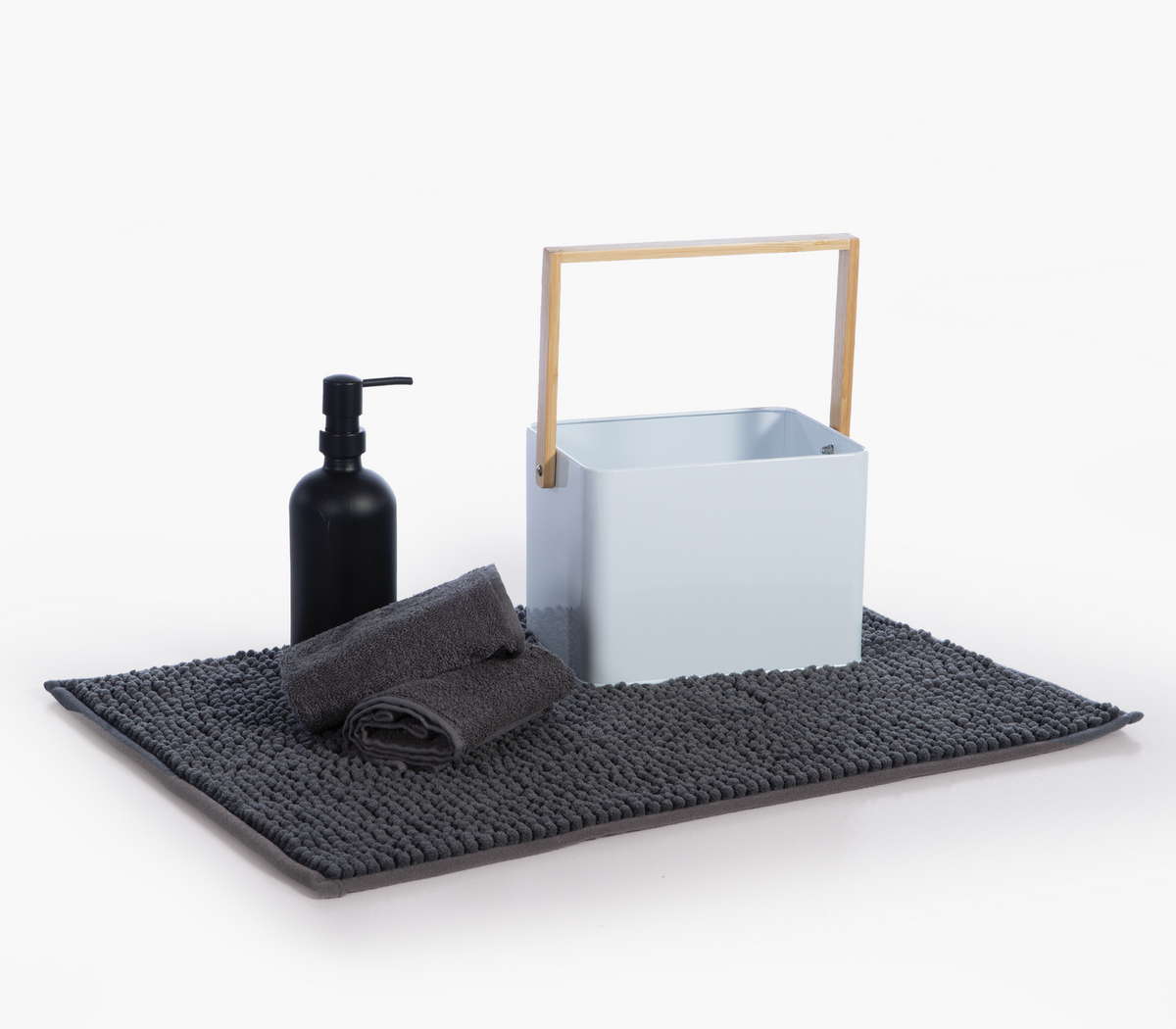 Σετ μπάνιου σε μεταλλικό καλάθι με ξύλινη λαβή, ιδανικό για πρακτική οργάνωση και κομψή διακόσμηση. Το σετ περιλαμβάνει ταπέτο μπάνιου 50x80cm, δοχείο κρεμοσάπουνου και 2 πετσέτες χεριών 30x30cm από 100% βαμβάκι. Μια ολοκληρωμένη πρόταση για να ανανεώσετε εύκολα τον χώρο σας ή για ένα προσεγμένο δώρο.